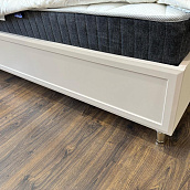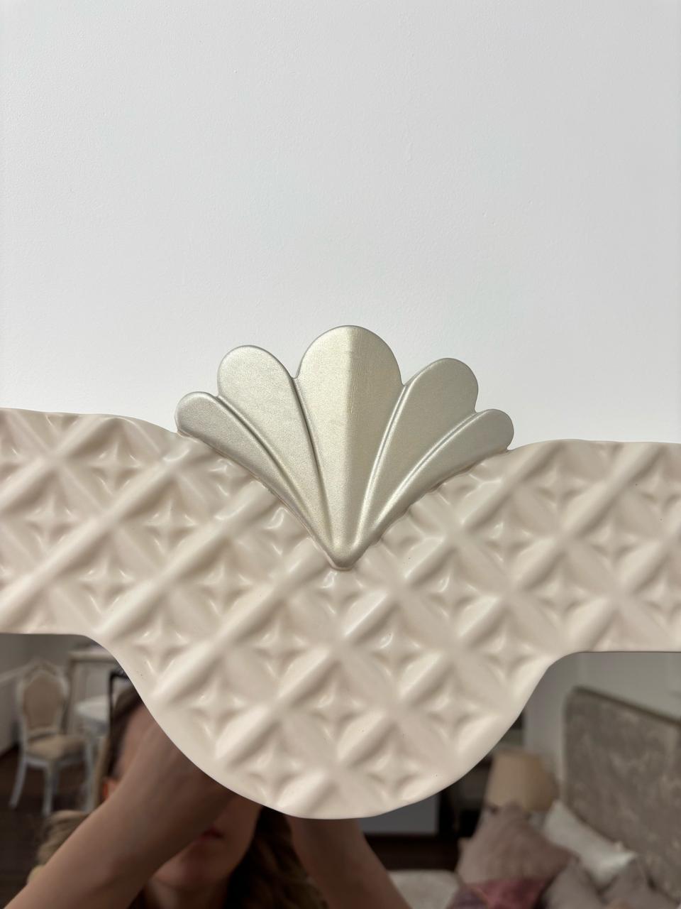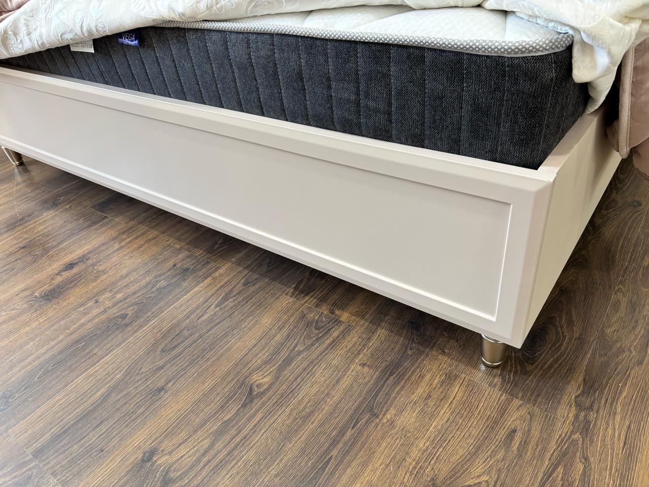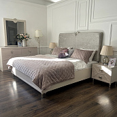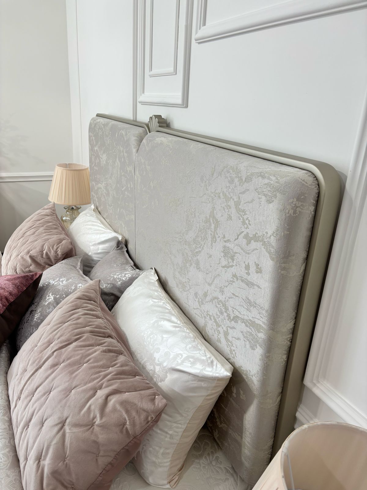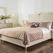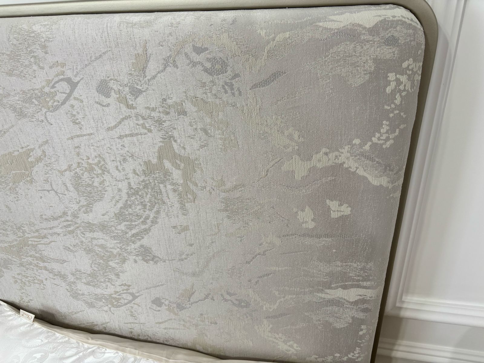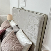 - Кровать с мягкой вставкой из мраморного жаккарда нежно серо-бежевого цвета