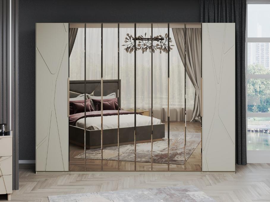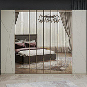 Шкафы представлены двумя моделями: четырёхдверный и шестидверный варианты. Фасады из фрезерованного МДФ, украшенные узорами мозаичного типа, вместе с зеркалами превращаются в настоящий живой калейдоскоп, наполняющий пространство таинственным свечением и игрой света. Внутренний механизм складных дверей позволяет экономить пространство, а качественная фурнитура продлевает срок службы шкафа и дарит наслаждение бесшумной работой.